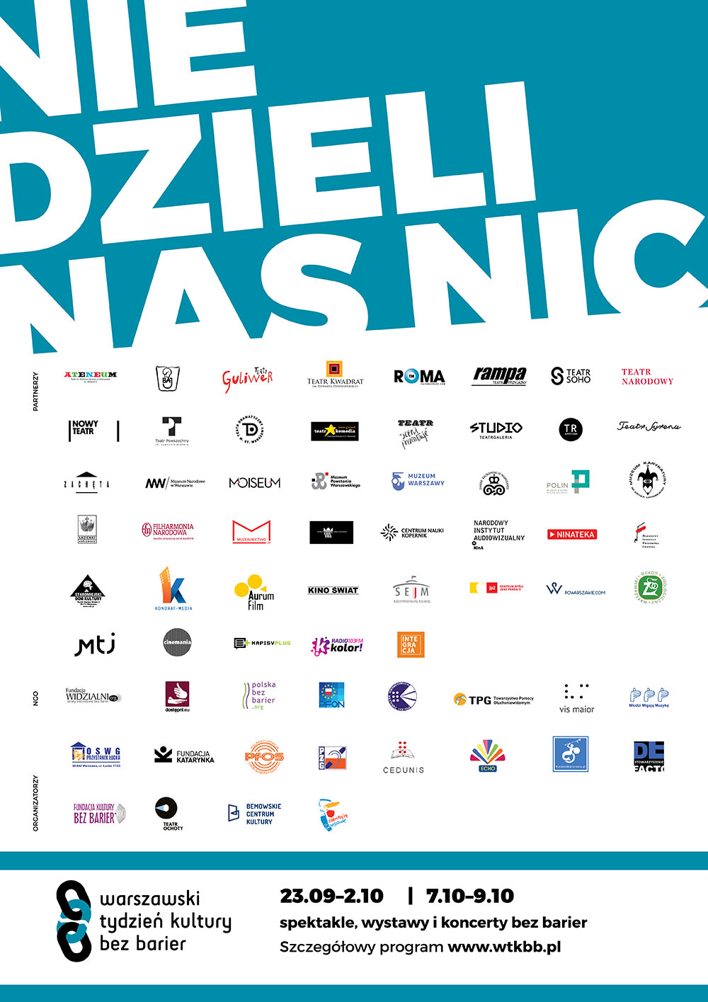Na przełomie września i października (23.09-2.10 oraz 7-9.10) rusza czwarta edycja Warszawskiego Tygodnia Kultury Bez Barier, a wraz z nim możliwość swobodnego korzystania z oferty stołecznych teatrów, kin, galerii i muzeów. Na czas festiwalu definitywnie znosimy bariery dotyczące dostępności. Dzięki zastosowaniu audiodeskrypcji, tłumaczenia na język migowy, pętli indukcyjnych oraz odpowiednich informacji na temat dostępności wydarzeń i miejsc, dostosowujemy wybrane spektakle, projekcie kinowe i wystawy dla osób z niepełnosprawnością sensoryczną, intelektualną i ruchową. Wraz z wolontariuszami szukamy sposobu na ułatwienie seniorom i rodzicom z małymi dziećmi wizyty w instytucjach kultury, a za sprawą darmowych wydarzeń i biletów w promocyjnej cenie ograniczamy wykluczenie finansowe. Krótko mówiąc pozbywamy się mentalnych podziałów i fizycznych ograniczeń.