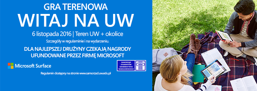 Ze sprzętem Microsoft studenci będą mogli zapoznać się już w niedzielę, 6 listopada, w ramach gry miejskiej „Witaj na UW!”. Zaprowadzi ona warszawskich studentów w różne rejony Kampusu Centralnego UW oraz okoliczne budynki uniwersyteckie. Jak przystało na nowoczesny uniwersytet, wszystkie „stacje” na których uczestnicy będą gromadzić punkty, zostaną wyposażone w najnowszy komputer firmy Microsoft: Surface Pro 4. W zabawie brać mogą udział 3-osobowe drużyny, które w swoim składzie będą mieć przynajmniej jednego „pierwszaka”, czyli studenta pierwszego roku studiów. Dla najlepszej ekipy przewidziano nagrody w postaci trzech komputerów Microsoft Surface 3.