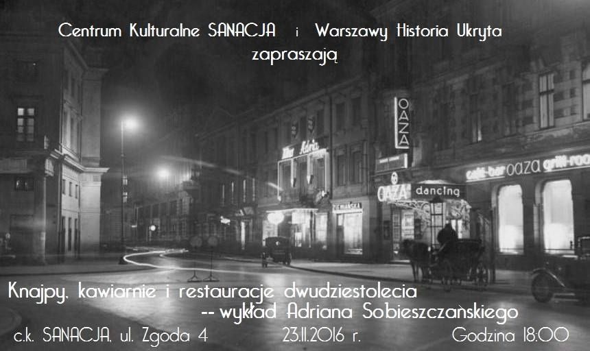 Czy jest ktoś, kto nie chciałby chociaż na chwile przenieść się w świat przedwojennych dancingów, rautów oraz literackich pojedynków? Czy jest ktoś, kto nie ma ochoty zasiąść do stolika na półpięterku, wdać się w dyskusje z Francem Fiszerem oraz zatańczyć na obrotowym parkiecie w Adrii? Zatem przekonajmy się jak wyglądały knajpy i restauracje międzywojnia! Sprawdźmy czy nasze wyobrażenia o nich samych (i ich bywalcach) mijają się z rzeczywistością, sprawdźmy czy picie kawy jest nałogiem, z czego słynęła ulica Gnojna, kogo na kolacje nie zapraszał Lechoń i kto miał pilnować, aby jego podwładni za dużo nie pili?