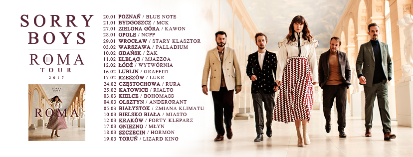 ROMA TOUR to premierowe koncerty z materiałem z "Romy", z którymi Sorry Boys odwiedzą ponad 20 miast w całej Polsce! To największa trasa koncertowa w historii zespołu. Dotychczasowe brzmienie zespołu zostanie wzbogacone na żywo o nowe, bardziej akustyczne instrumentarium. Obok piosenek z najnowszego albumu, znajdą się także najbardziej znane utwory z poprzednich płyt. Podczas trasy pojawiać się będą muzyczni goście, których usłyszeć można na płycie "Roma". ROMA TOUR rozpocznie się 20 stycznia 2017 w Poznaniu i zakończy 19 marca w Toruniu.