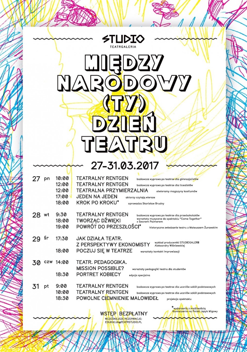 27 marca obchodzony jest Międzynarodowy Dzień Teatru. Z tej okazji STUDIO teatrgaleria przygotowało liczne wydarzenia dla dzieci, młodzieży, studentów i dorosłych. Niektóre z wydarzeń zostały przystosowane do odbioru przez osoby z niepełnosprawnościami słuchu.