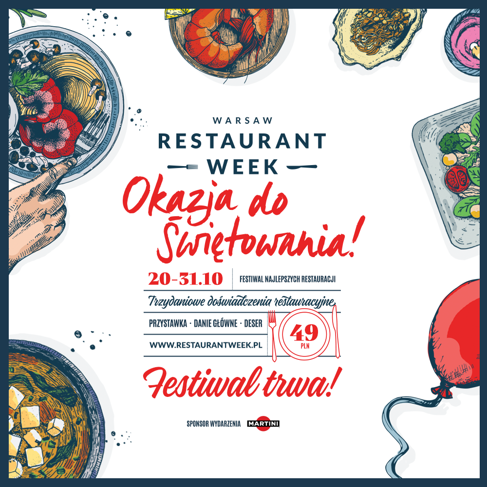 Festiwal Restaurant Week jest cyklicznym ogólnopolskim wydarzeniem prezentującym najlepsze polskie Restauracje. W ciągu zaledwie dwóch i pół roku z weekendowego wydarzenia w stolicy stał się największym kulinarnym wydarzeniem w kraju, w którym udział wzięło już ponad ćwierć miliona Gości w ponad 30 miastach. Najlepsi w kraju Szefowie Kuchni przygotowują każdorazowo trzydaniowe popisowe menu festiwalowe (przystawka, danie główne, deser) w wyjątkowej cenie 49 zł. W jubileuszowej edycji na Gości będzie czekać również niespodzianka pod postacią aperitifu.