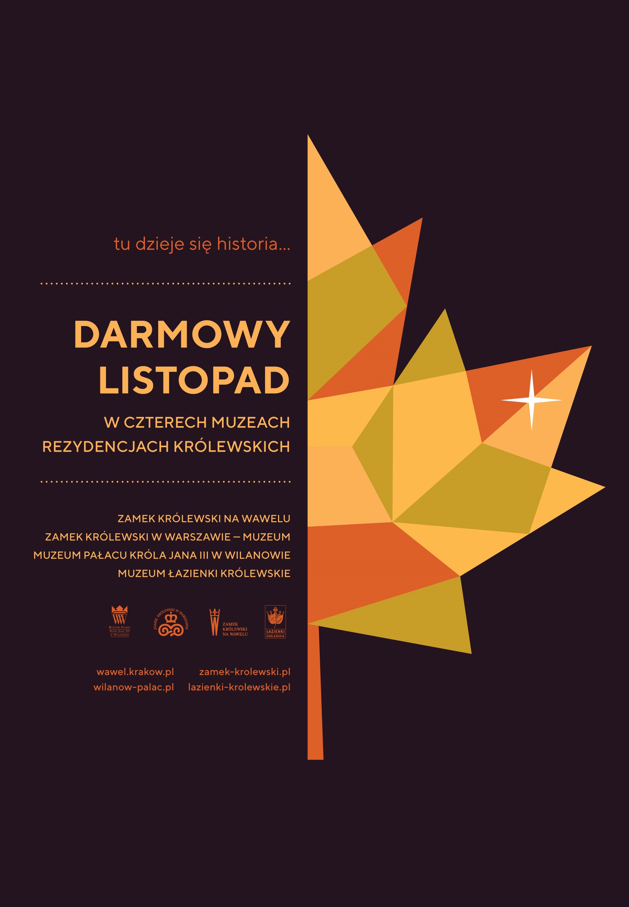 Akcja „Darmowy Listopad” jest częścią programu Kultura Dostępna, realizowanego przez Ministerstwo Kultury i Dziedzictwa Narodowego. Dzięki wsparciu MKiDN Muzeum Pałacu Króla Jana III w Wilanowie przygotowało bogatą ofertę bezpłatnych spotkań muzealnych i przyrodniczych oraz warsztatów dla rodzin z dziećmi, które stanowią znakomitą okazję do poznania pałacu i jego mieszkańców oraz twórczych prac inspirowanych historią i kulturą dawnej Rzeczypospolitej.