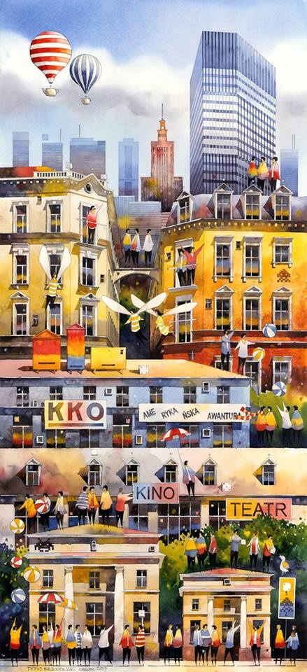 Autorem projektu jest akwarelista i architekt Tytus Brzozowski. Jego zamiłowanie do miejskich murów idealnie wpisuje się w koncepcję – na projekcie znajdują się Rogatki Wolskie, charakterystyczne dla tego obszaru kamienice oraz narożnik Chłodnej i Okopowej. W tle zobaczymy zabudowania Centrum – Pałac Kultury i Szklane Wieżowce. Mocnym akcentem kompozycji będzie projekt wieży Spark. Na pierwszym planie ujrzymy ludzi nieodzownie kojarzących się z wielkomiejskim gwarem. Loty na parasolkach, kolorowe, dmuchane piłki, sylwetki ludzkie ze skrzydłami o pszczelim charakterze nadają całości dynamiki.
