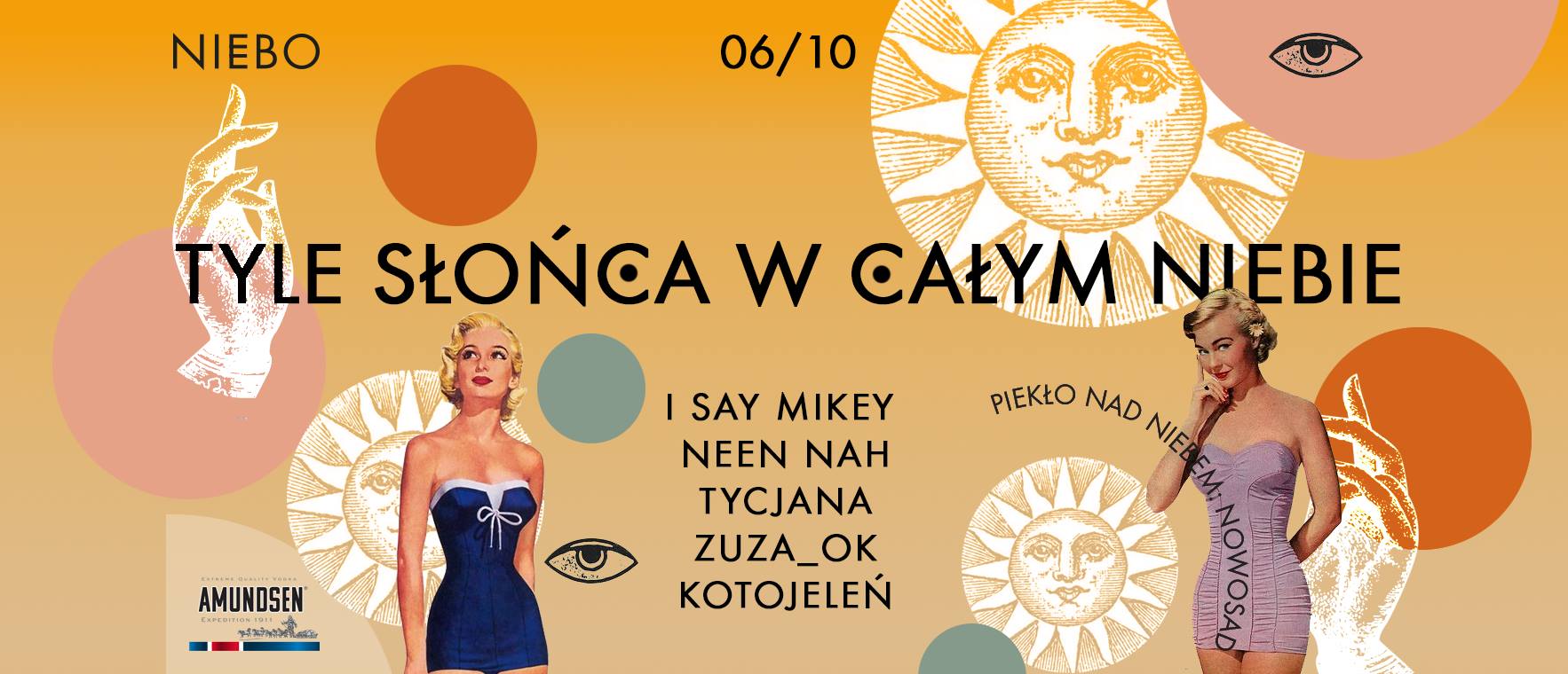 Gwiazdka w tytule oznacza, że Ci z listy FB do godz. 23:00 wchodzą za free, osoby przybyłe po czasie lub z poza niej płacą 20zł. Klub Niebo przywołuje słońce i odgania jesienne chmury. Za Dj`ką pojawią się: I Say Mikey (AM Radio), NEEN NAH & zuzaOK ( International Girls DJ's ), Tycjana ( Princess Rap ) i Kotojeleń ( Rapperoni ). Start: 22:30, wstęp tylko dla 20+.
