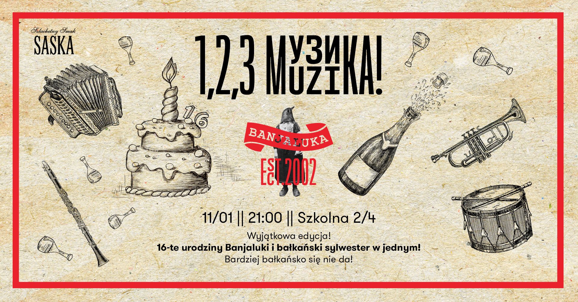 Jedna z najlepszych warszawskich knajp obchodzi swoje 16-te urodziny. Która? Ta, w której umilają wieczory nie kończącym się, bałkańskim winem, śpiewem i kuchnią, która śni się potem ludziom po nocach. Mowa oczywiście o lokalu Banjaluka. Oczywiście nie zabraknie muzyki na żywo, toastów i zimnych ogni (rocznica zbiegła się w czasie z bałkańskim nowym rokiem). Na biesiadzie pojawi się również – uwaga, uwaga – mięsny tort autorstwa szefa kuchni Olafa. Was również nie może więc zabraknąć!