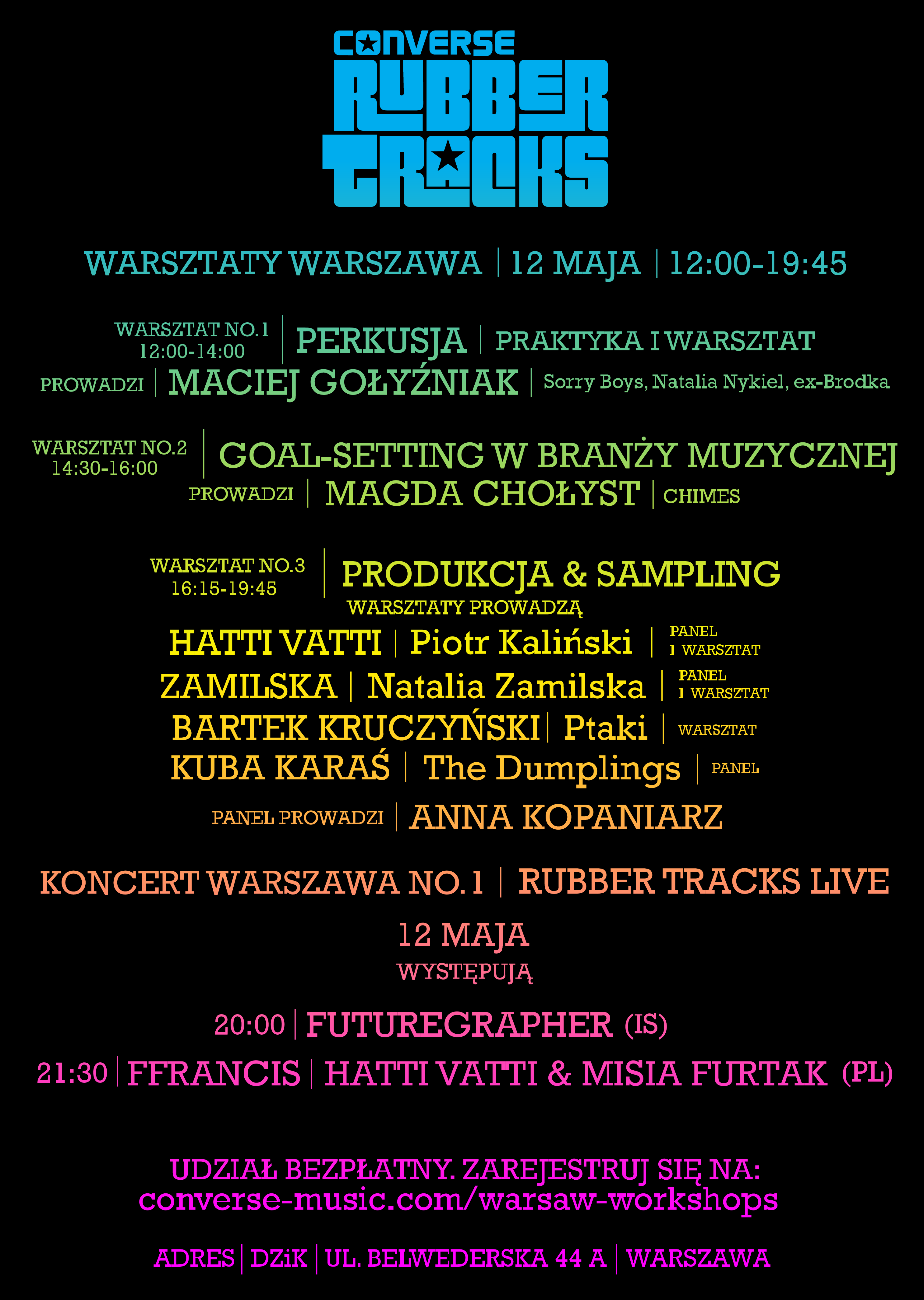 W Warszawie rozpoczynamy warsztatem perkusyjnym z Maćkiem Gołyźniakiem. Tego dnia również wspólnie z ekipą producentów: Hatti Vatti, Zamilską i Bartkiem Kruczyńskim z zespołu Ptaki będziecie mogli zgłębić tajniki profesjonalnego samplingu korzystając z obszernego zbioru sampli na Converse Rubber Tracks Sample Library. Warsztaty rozpoczną się panelem dyskusyjnym, w którym oprócz ekipy wymienionych wcześniej producentów weźmie udział Kuba Karaś z The Dumplings. Panel poprowadzi Ania Kopaniarz. Na zakończenie Magda Chołyst poprowadzi swój autorski warsztat, podczas którego podzieli się wiedzą na temat tego jak poradzić sobie w branży muzycznej. Równie interesujący zestaw muzycznych tematów będzie na Was czekał podczas warsztatów w Katowicach: Paulina Czapska, która podpowie jak wybić się w branży muzycznej oraz Hatti Vatti, Zamilska i Bartek Kruczyński z formacji Ptaki, którzy poprowadzą warsztat dla producentów z zakresu samplingu. W katowickim panelu dotyczącym samplingu i produkcji prowadzonym przez Anię Kopaniarz, weźmie również udział Kuba Karaś z The Dumplings.